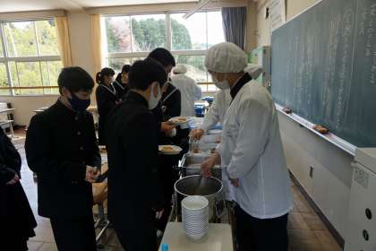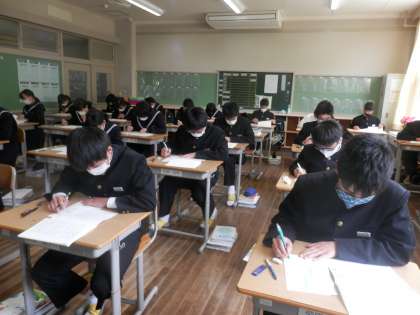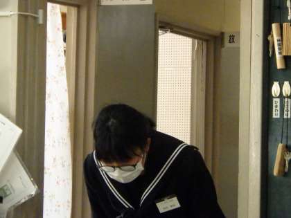 1枚目は、職員室への入室の仕方、2枚目は給食の準備の様子、3枚目はテスト中の様子です。