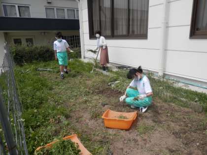 家庭訪問も3日目となりました。訪問をしていると、涼しい下山とはいえ、少し暑さも感じる日でした。写真は授業の様子です。1年ささゆり学級の学級園の整備(上)、2年国語科で物語文の学習(中)、3年理科で力の分解の学習(下)です。