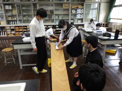 1年生は美術で鉛筆でデッサンの学習をしていました。手を真っ黒にしながら陰陽をつけていました。2年生は技術で電気エネルギーについて学習をしました。3年生は理科で斜面を下る物体の運動について実験を行いました。