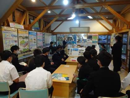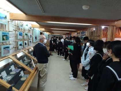 10月29日 修学旅行3年 琴引浜・鳴砂文化館 館長さんの説明、興味津々と聞き入る生徒