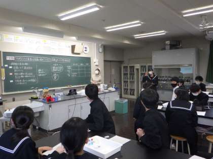 3年生は理科で、イオンになりやすさについて、自分たちで書いた図を用いて議論していました。(3枚目)