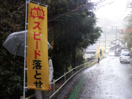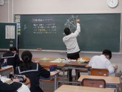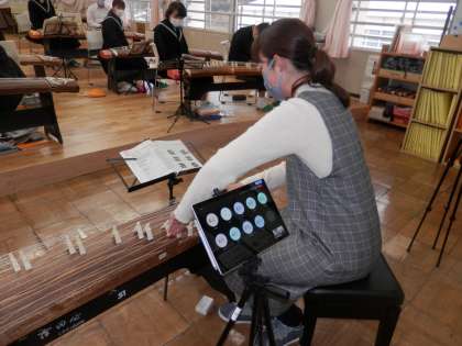 1年生は、数学科の学習で、回転移動を学びました。コンパス、分度器が上手に使えるとよいですね。2年生は、音楽科の学習で、箏の演奏方法を学んでいます。学習用タブレットを活用して、教師の演奏方法を見せています。3枚目の写真は、通学路に交通安全の旗を設置したところです。あいにくの雨でしたが、何とか無事に設置することができました。