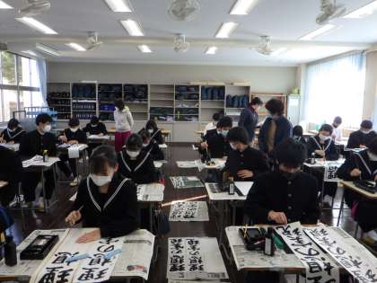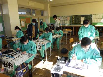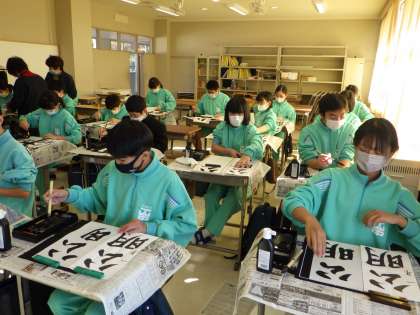 講師の先生をお招きして、年明けの書き初め大会に向けて書道の授業をおこないました。みなさん、先生からのアドバイスを参考に、集中して取り組んでいました。