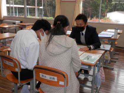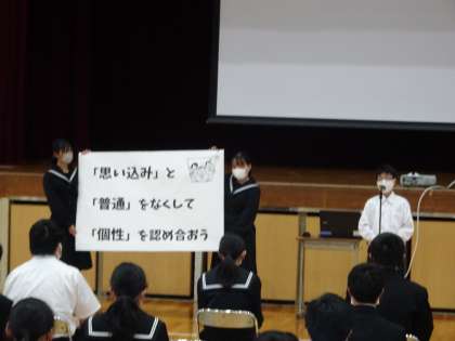 本日より個別懇談会が始まりました。3年生は進路決定に向けての話し合いもあり、特に真剣に行われていました。1限目には、人権週間にちなんで、全校で「人権集会」が行われ、各クラスがいじめのない学級への取り組みについて宣言をしました。