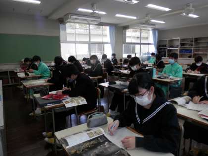 個別懇談会は最終日でした。お忙しい中、ありがとうございました。写真は1、2年生は家庭科で、おせち料理について学びました。それぞれの家庭のおせちも紹介できました。3年生の美術の授業は仏像についてです。様々な形や表情をもつ仏像の種類から、自分の気に入ったものを選んでみました。
