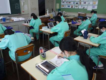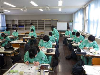 美術の時間では、1年生は、自分の写真を見ながら自画像を丁寧に書いていました。3年生は、墨の濃淡を上手く使いながら絵や文字を表現していました。