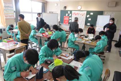 今日は5時間目に講師の方をお招きし、1年生が「くじ引きドローイング」を行いました。くじで引いたお題をもとに、子供たちは自由な発想で絵を描いていました。下中生が新たに書いたお題は、講師の方によって次の学校へ引き継がれます。生徒が書いた作品はしばらく学校に掲示しますが、のちにくじ引きドローイングのサイトでアーカイブされる予定です。