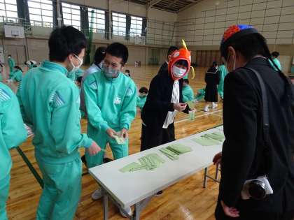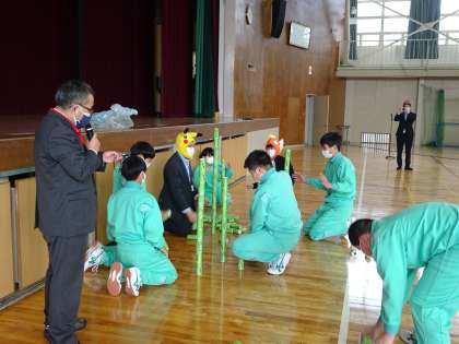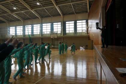 1時間目に臨時の全校集会を行いました。「澤木教頭先生最後の授業〜先生チームに勝って、進級認定を勝ち取れ!〜」と題して、今年度末で定年退職される教頭先生の最後の授業として、全校でレクリエーションをして楽しみました。無事に進級認定を勝ち取れたクラスも、先生チームに負けてしまい、明日まで保留になってしまったクラスもありましたが、全校で楽しんで行うことができました。先生チームに負けてしまったクラスは明日が楽しみですね!