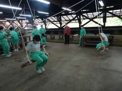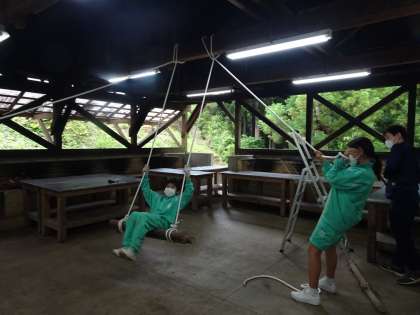 5月13日 宿泊学習1年 2日目 ロープワーク 学んだことを応用して、ブランコ、ハシゴ、縄ばしごを作りました。