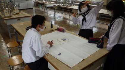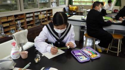 授業では、1年理科でマツの観察をしたり、3年音楽科で校歌のテストをしたりしました。2年生は級訓の掲示物や表現運動で使う小物づくりをみんなで協力して行いました。