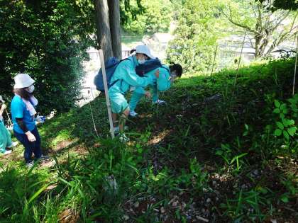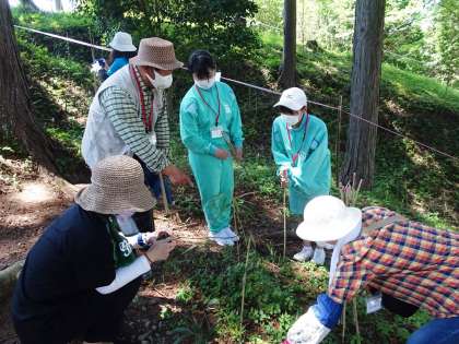 芽を見つけたところに、目印の棒を立てました。芽は、他の植物と見分けがつきにくいので、わかることと、草刈り機等でいっしょに刈られないよう注意を促すとう役割があります。