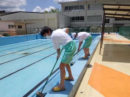 プール清掃を行いました。2年間使っていなかったプールがすごくきれいになりました。水泳の授業が楽しみですね。