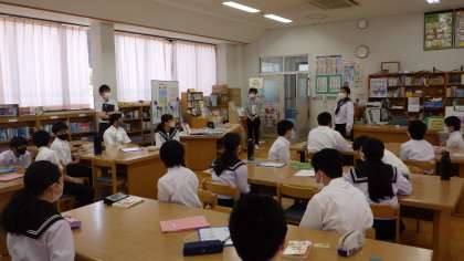 3枚目の写真は、朝の会の様子です。週に1回、朝の会を学校図書館で行い、本に親しむ機会を増やしています。