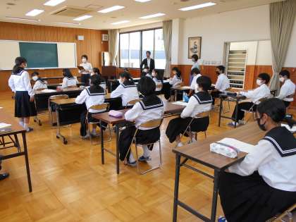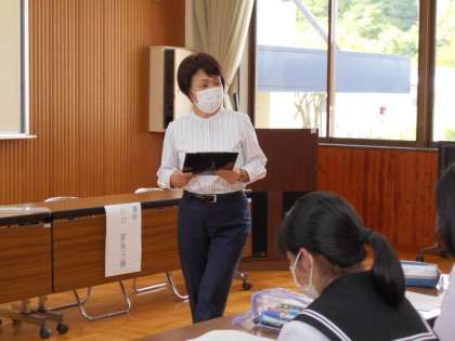 来週からの職場体験学習に向けて、2年生が「マナー講座」を受けました。講師をお招きして、思いやりを大切にする社会のマナーについて学びました。好印象の5条件「身だしなみ」「表情」「立ち居振る舞い」「あいさつ」「言葉遣い」について、トレーニングをしながら分かりやすく教えていただきました。3枚目の写真は、お辞儀の仕方の実践トレーニングの風景です。