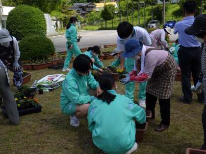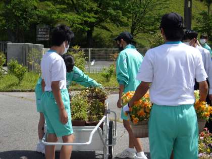 本日2時間目に2年生が、夏の花のマリーゴールドを、プランターに植える活動を行いました。ロータリーの花を植え替えることで、学校を美しくする気持ちを高めました。
