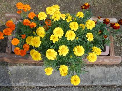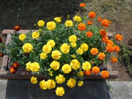 たっぷりの雨とたっぷりの日光のおかげで、ロータリーのマリーゴールドが、さらに大きく成長し、プランターからあふれるくらいにきれいな花を咲かせています。