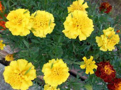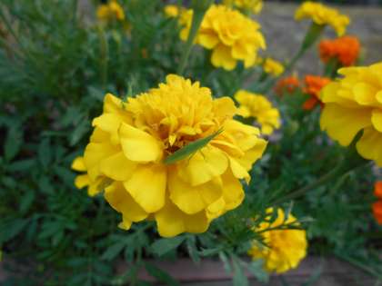 ロータリーのマリーゴールドの花に、赤ちゃんバッタでしょうか、ミニバッタがちょこんと乗っています。とても可愛くて、心が和みます。