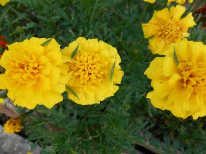 3枚目の画像には、黄色のマリーゴールドの花に、なんと合計10匹のミニバッタがいます。見つけられますか?