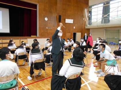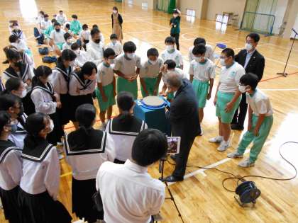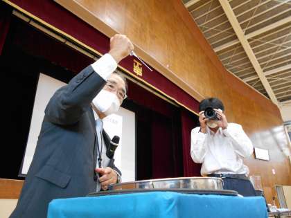槇野先生の自作実験装置で、雨粒が落ちてくるときの水滴の形を見ることができ、生徒たちは感動していました!