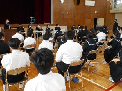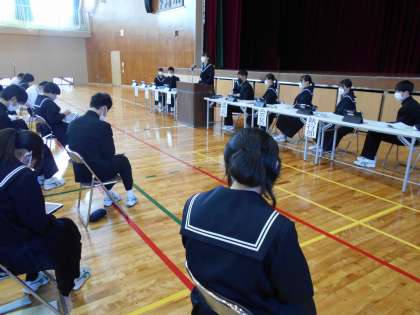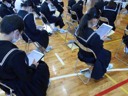 5時間目に、生徒総会が行われました。事前に配信された各委員会の資料を、学習用タブレットで見ながら提案を聞き、積極的に意見交換する姿が見られました。
