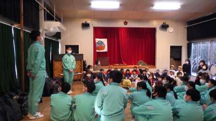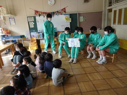 3年生は、大沼こども園で保育体験学習を行いました。自分たちで作った紙しばいを園児に読んだり、園児が発表した劇を見たりしました。、