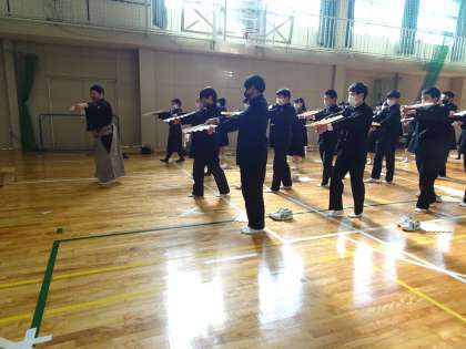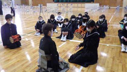3名の能楽師を講師に迎え「能に親しむ会」を実施しました。小鼓、面、仕舞の3種類の体験をしました。生徒は興味津々で体験を楽しんでいました。