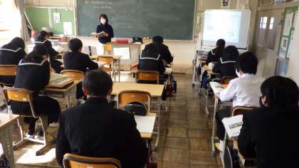 2年生は、少人数制で社会の授業を受けている様子です。タブレットを活用して、視覚的に理解がしやすいように工夫がされています。学習診断テストや定期テストに向けて、頑張って取り組んでほしいと思います。