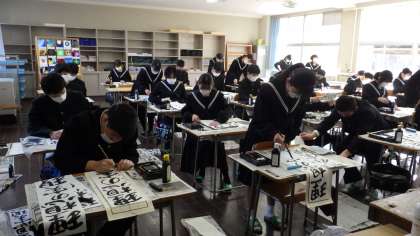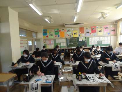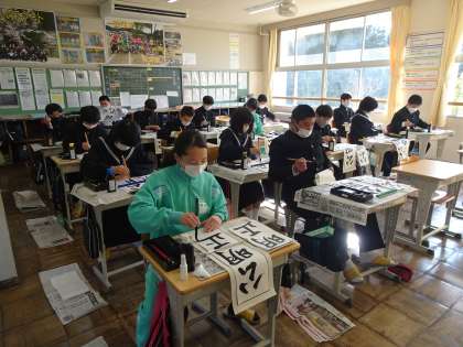 例年より少し長かった冬休みが明け、学校が再開しました。1時間目には、全校集会で校長先生より今後の行事予定に関するお話がありました。2,3時間目には書き初め大会が行われ、どの生徒も集中して黙々と筆を動かしていました。