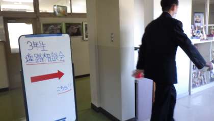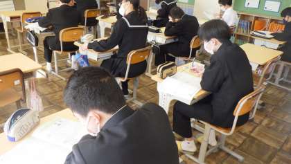 2年生は朝7時、自然教室に出発しました。スキー研修をはじめ、立志のつどい、その他の企画など、内容は盛りだくさんです。またこの学年は中学に入って、初めて宿泊を体験します。いろいろな意味で成長することでしょう。留守を守る1・3年生ですが、総合の時間には、1年生は進路コンパスの実施、3年生は進路相談会と、それぞれの将来に向けた活動を進めています。
