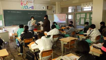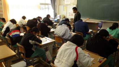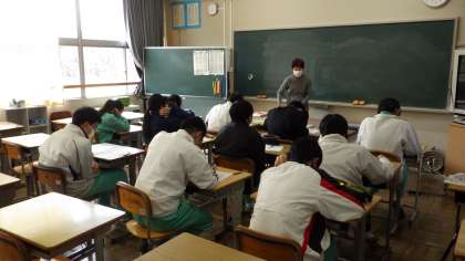 3年生の数学の授業は、習熟度別で行っています。たいへん効果的で成果も上がっています。もう1枚の写真は、英語の授業の様子です。コミュニケーション能力を高めています。
