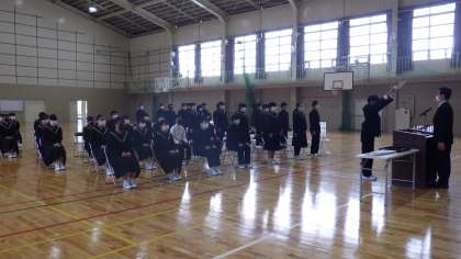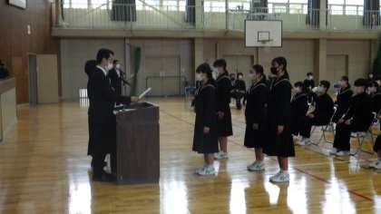 今日は1年に1回しかない、修了式の様子です。1枚目は2年生が終了証を受け取っている写真です。2枚目は1年生が終了証を受け取っている写真です。3枚目は令和5年度の前期生徒会の認証式の写真です。全員が担任や担当の呼名に対してしっかり返事をしいて、4月からの新3年、2年の活躍が楽しみになりました。