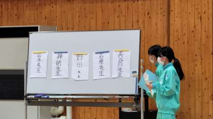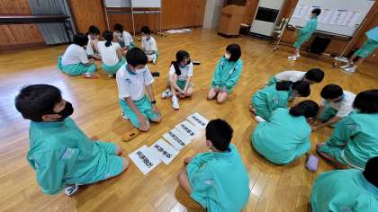 グラデーションゲームをしています。下山中学校の先生たちの誕生日を、月毎に並べたり、年齢順に並べたりしながら、ポイントを獲得していきました。