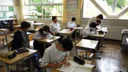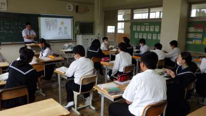 英語科の授業では、英会話を聞き取った内容を友達同士で確認するなど、みんなで力を合わせて学びを深めています。