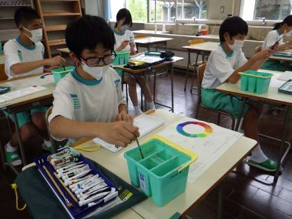 今日の1年生の美術の授業では、色の三要素について学びました。色相、明度、彩度をそれぞれ考えてワークシートに色を塗っていきます。思うように作りたい色を作れず、難しさを感じながらも、楽しく色の世界を体感していました。