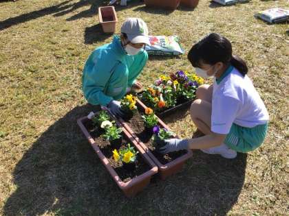 しかし、順延日はさわやかな秋晴れになり、冬の花として「パンジー」をプランターに植え、ロータリーを囲むことができました。