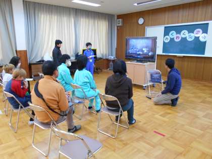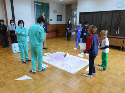 各学校から出し物やゲームを披露し、みんなで楽しみながら交流しました。下山中は「あわてんぼうのサンタクロース」のパネルシアターを発表しました。