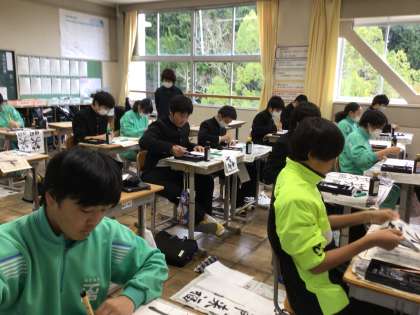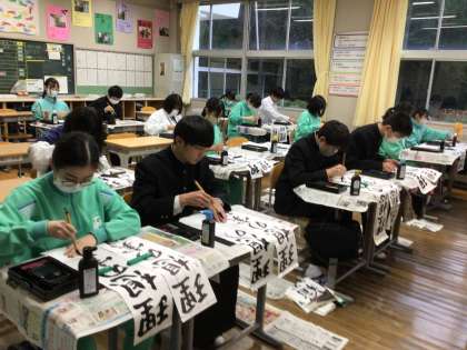 1月9日の書き初め大会に向けて、各学年の国語の授業で書き初め練習をしています。書き初め指導ボランティアの先生も来校され、熱心なご指導をしていただきました。一枚目は一年生、二枚目は二年生、三枚目は三年生の書き初め練習の様子です。