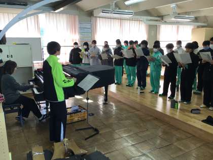 音楽科の授業では、卒業式の全校合唱に向けて練習をしています。今までは各学年で音とりをしてきましたが、ある程度できてきたので、今日は1・2年生で合わせてみました。初めてでしたが、きれいなハーモニーを響かせることができました。本番に向けて、もっと上手になっていくのが楽しみです。