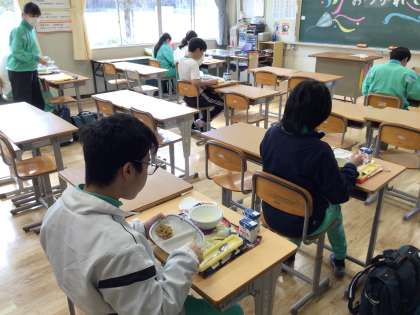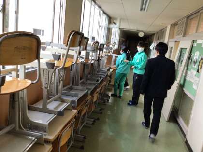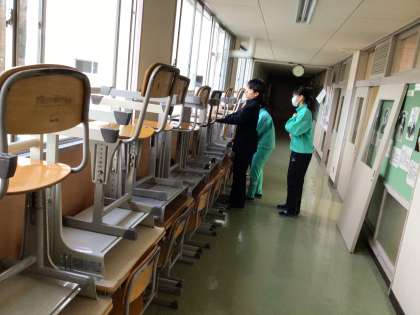 本日は私立高校一般入試のため、3年生の教室は閑散としています。残った生徒で奉仕活動として、教室のワックス掛けの片付けなどをしました。