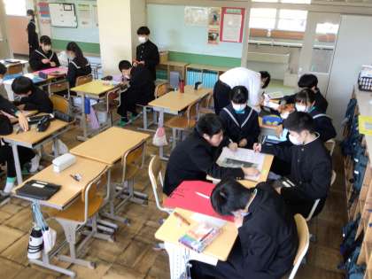 2年生は、級訓を決定したり掲示物を作成したりしました。どの学年も、新年度の準備に奔走しています。