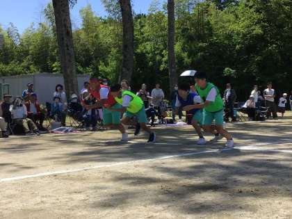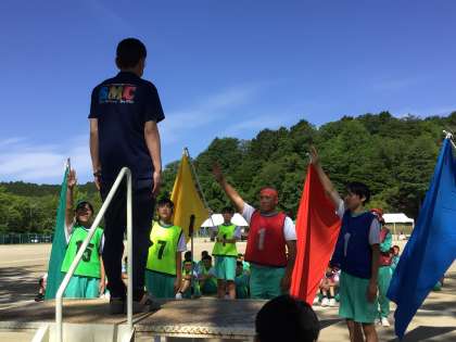 体育祭が行われました。今年度は、緑、黄、赤、青4つので戦いました。リレーでは、サプライズもありましたが、無事にスタート出来ました。