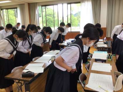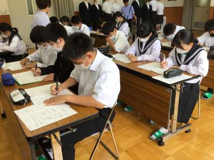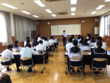 2年生が、職場体験に向けて、マナー研修を受けました。好印象の条件は、身だしなみ、表情、立ち居振る舞い、挨拶、言葉遣いと、教えていただき、自己チェックをしながら、研修に取り組みました。