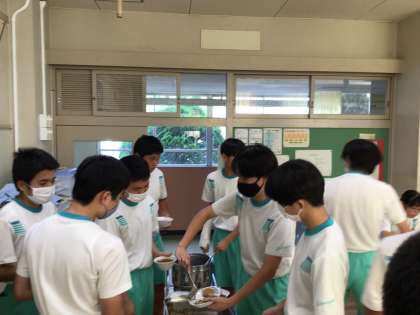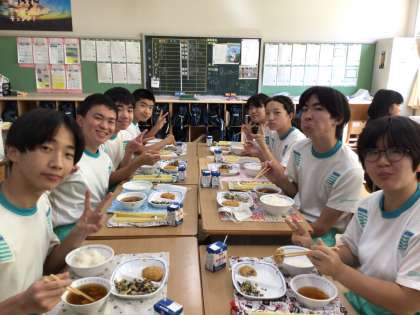三年生の給食の様子です。一枚目は一個のメンチカツをめぐってジャンケンをしている様子です。二枚目はみんなでポーズ。三枚目はおかわりの様子です。