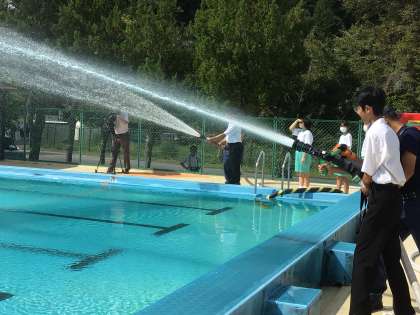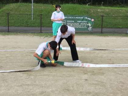 消火栓の開け方や消火ホースでの放水、ホースの結合を体験しました。