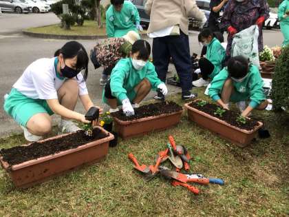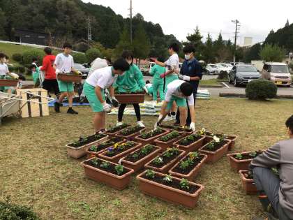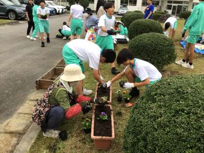 地域の方に手伝っていただきながら、1年生がロータリーのプランターにパンジーを植えました。下山中を訪れた人にきれいだなと感じてもらえるといいなと思います。
