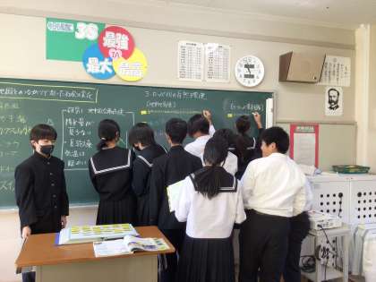 1年生の授業ではいつも挙手発言が止まりません。今日も調べた課題について、たくさんの子が黒板に書き込みしていました。