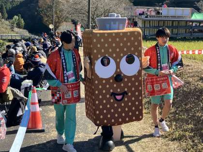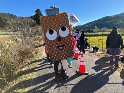 三河湖SSの観戦エリア内で、下山地区のキャラクター「五平マン」に扮したり、ステッカーを配ったりして会場を盛り上げました。