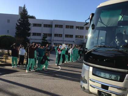 2、3年生全員が見送る中、豊田市野外センターに向けて出発しました。