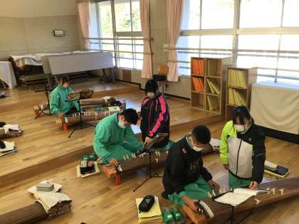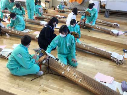 12月の音楽の授業で箏の体験をしています。1年生は初めて演奏する生徒が多いですが、ペアで楽しく練習しています。2年生は新しい奏法を練習しています。