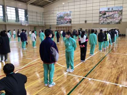 生徒会が企画したレクリエーションを行いました。色団ごとに、ジェスチャーで伝言を回し、最後まで正しく伝われば成功というゲームでした。みんな楽しくできました。